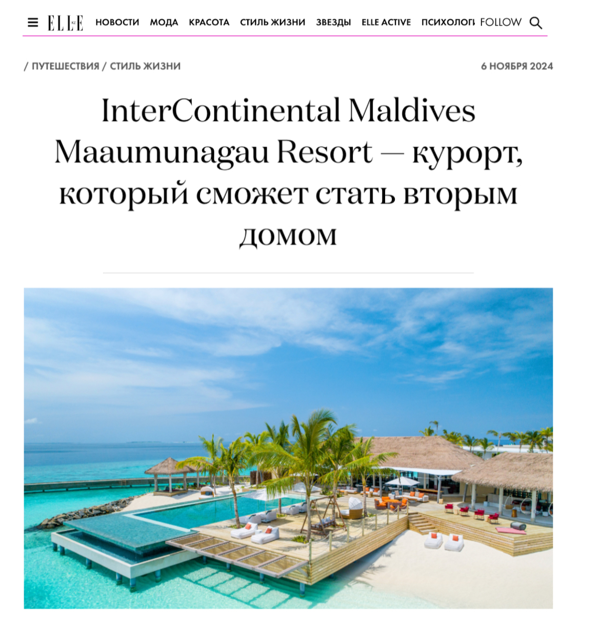 ELLE Kazakhstan makes an overview of InterContinental Maldives Maamunagau Resort, which opened in 2019 and has quickly become one of the most sought-after destinations in the Maldives. The article highlights the resort’s wellness offerings, authentic Maldivian hospitality, and a wide range of accommodation options.
