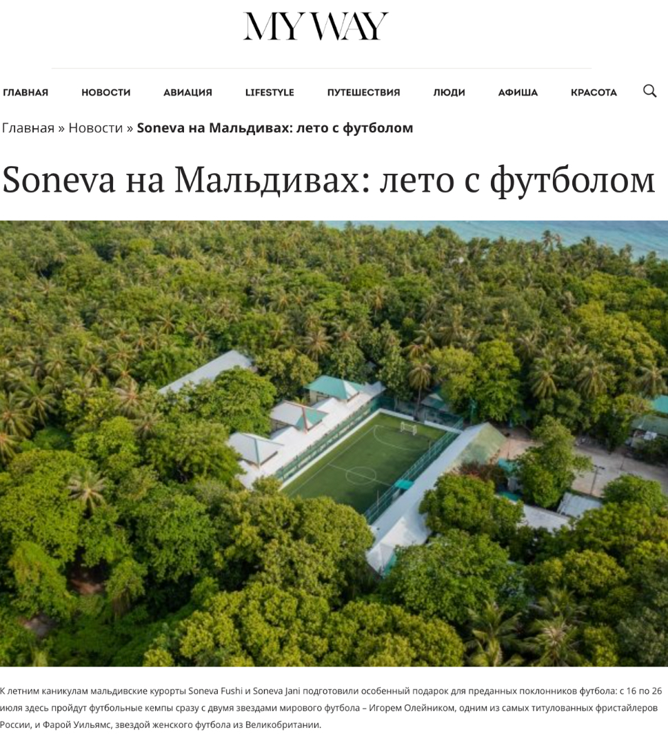 MYWAY, a modern Russian lifestyle magazine, highlights a summer adventure for young guests at Soneva Fushi and Soneva Jani. The article presents a special football camp featuring global stars Igor Oleynik (Russia) and Fara Williams (UK), who led a series of masterclasses and friendly matches. The program combined sport, fun, and learning, ensuring an unforgettable holiday experience for children.
