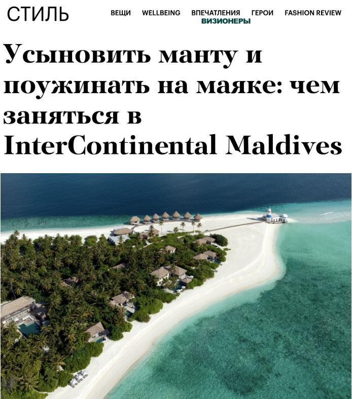 RBC Style, one of the leading Russian media outlets, offers a detailed look at the experience of staying at InterContinental Maldives Maamunagau Resort. The article highlights manta ray encounters, signature dishes by acclaimed chefs, yoga sessions with renowned gurus, and a diverse spa offering—all tailored to provide guests with an enriching and relaxing stay.